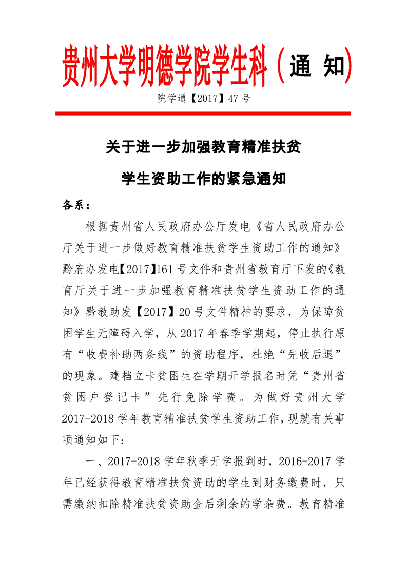 贵州大学明德学院关于进一步加强教育精准扶贫学生资助工作的紧急通知