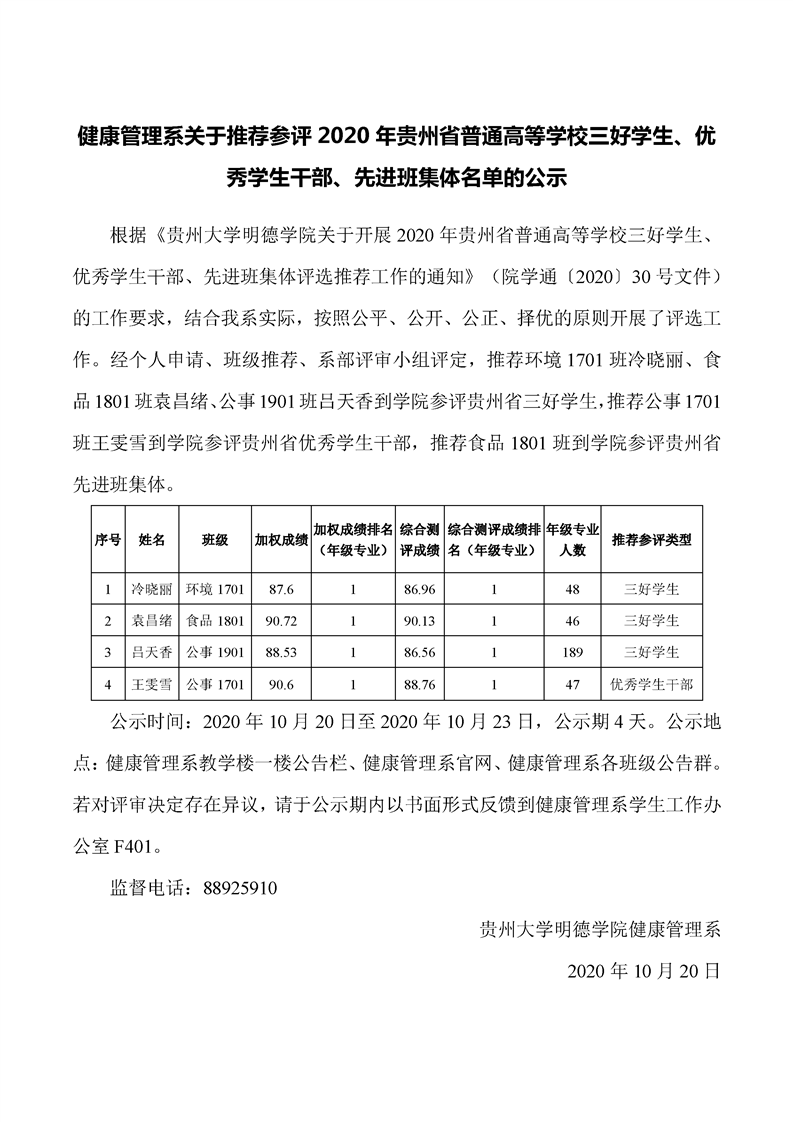 健康管理系关于推荐参评2020年贵州省普通高等学校三好学生、优秀学生干部、先进班集体名单的公示