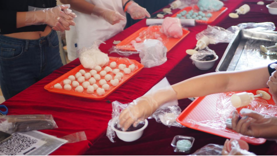 活动现场还设置了汉服展示、DIY月饼、DIY花灯、投壶、套圈等具有中秋特色的互动体验活动,每个游戏区位前都排着长长的队伍,等候的同学们翘首以待、跃跃欲试,参与的同学尽情投入、乐在其中。最火爆的当属“猜灯谜”活动,上百条灯谜让同学们玩有所乐、学有所得,了解丰富的中秋民俗民风,感受中国传统节庆魅力。