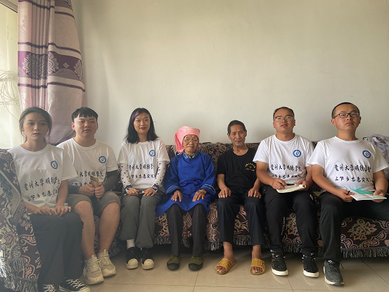 在小组负责人的安排下,志愿者们分为三个小组同时走访慰问三位老党员。第一组志愿者拜访的是老党员是蒙以成爷爷,到达老党员家中后,志愿者们首先向蒙爷爷表明了走访的来意并向老党员送上米、油、工艺剪纸等物资。随后老党员热情招待志愿者们坐下交谈,志愿者们通过走访慰问老党员,了解到他们的在党经历,生活条件及健康状况。访问期间,当老党员诉说起往日队伍中的事迹时,他起身走向房间,拿出一份并不起眼的档案袋,向志愿者们展示了自己珍藏的各种证件和当年身处的步兵93团及师炮团的贵定战友会纪念照。此外,党员爷爷也向志愿者们分享了他的入党经历、入党心得和家庭的日常生活。