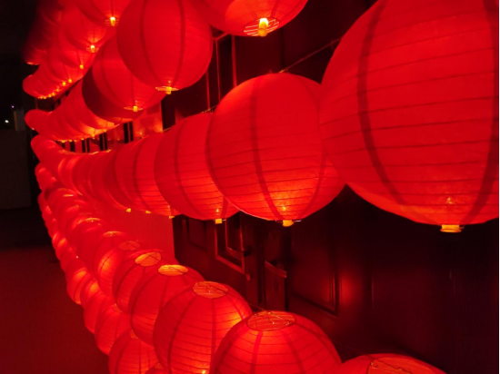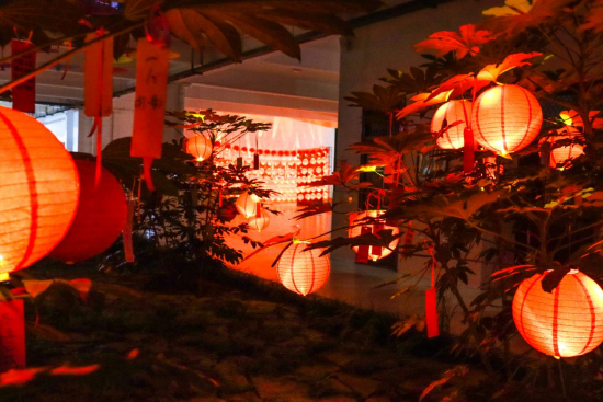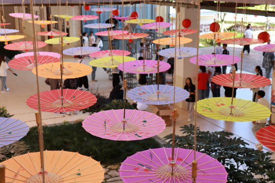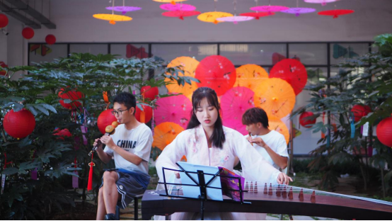 在传媒楼一楼的活动入口,纵横罗列的彩色灯笼彰显着浓厚的传统民俗文化。一踏入仿若闯入一场绮丽的梦境,那绚丽的景观,微澜入心,四周点缀着色彩缤纷的油纸伞,让人不知不觉沉醉于此。这里也成为了当晚最火爆的“网红打卡地”之一。古筝表演、笛箫演奏……更加深了现场浓厚的节日氛围,同学们一边看节目,一边吃月饼,清风拂面、绿草青葱,扑面而来的是幸福生活的味道。