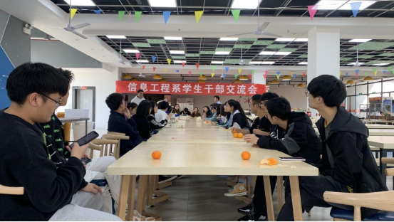 2022年4月3日下午14:30,yabo鸭脖官网信息工程系团总支学生会在二食堂五楼举办了信息工程系学生干部交流会。信息工程系党总支书记谢尧老师、谭礼晶老师、穆筱琪老师及各学生干部等参加了此次活动。