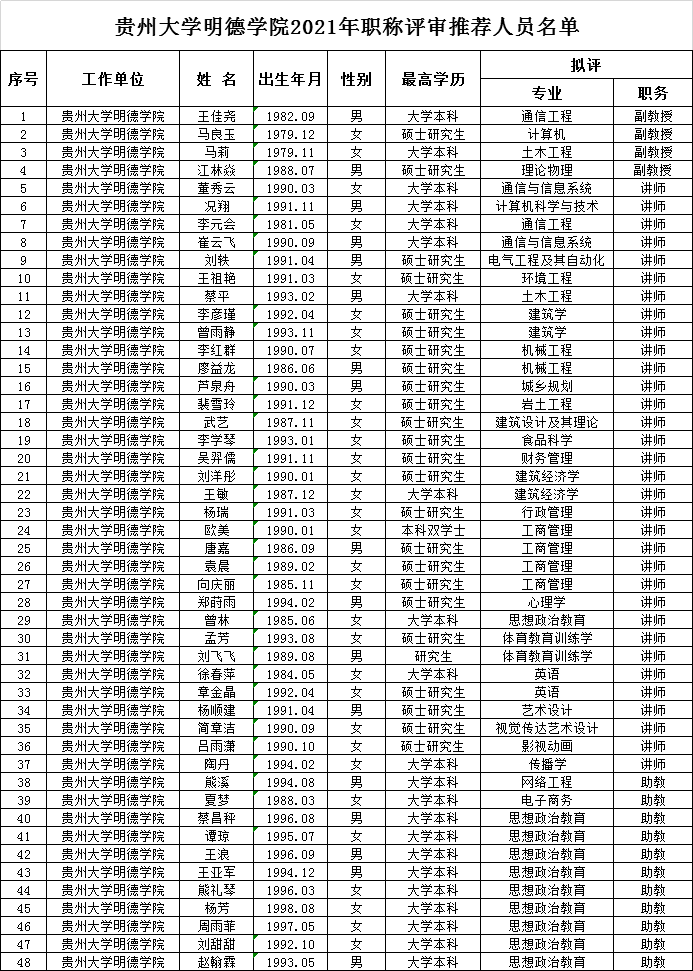 贵州大学明德学院2021年职称评审推荐结果公示