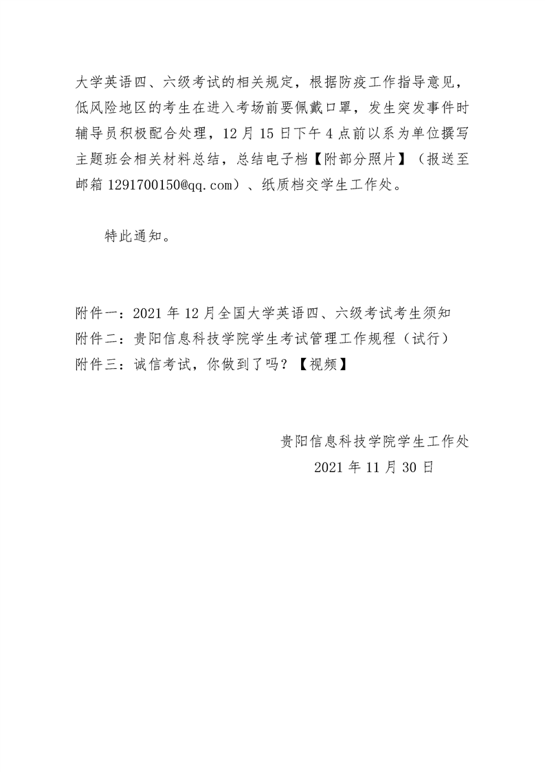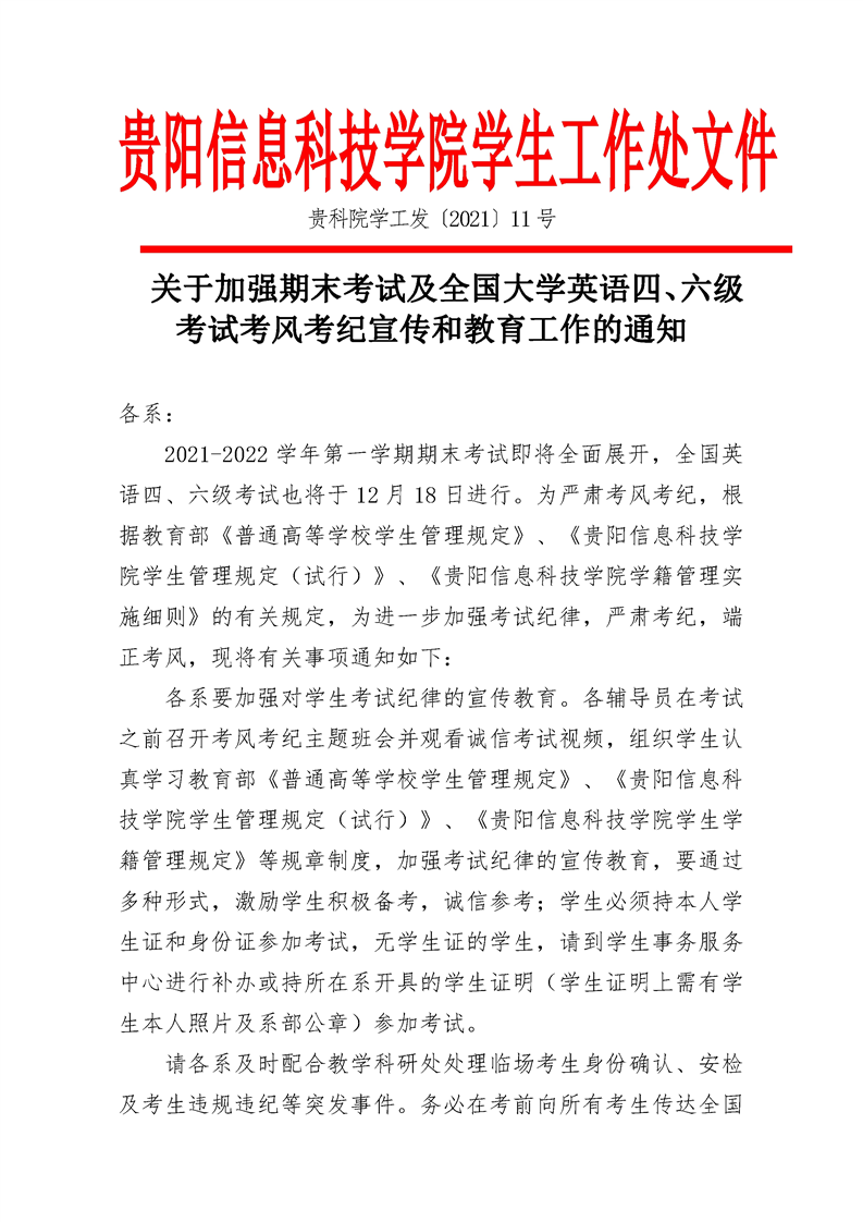 关于加强期末考试及全国大学英语四、六级考试考风考纪宣传和教育工作的通知