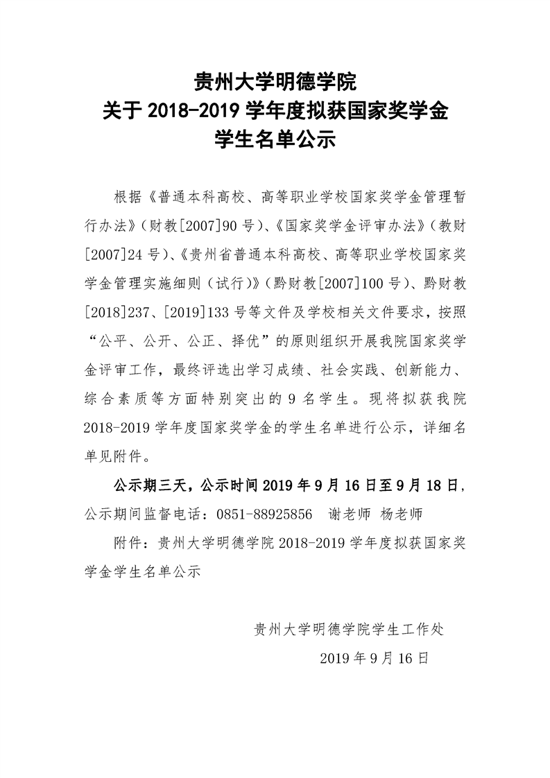 贵州大学明德学院关于2018-2019学年度拟获国家奖学金学生名单公示