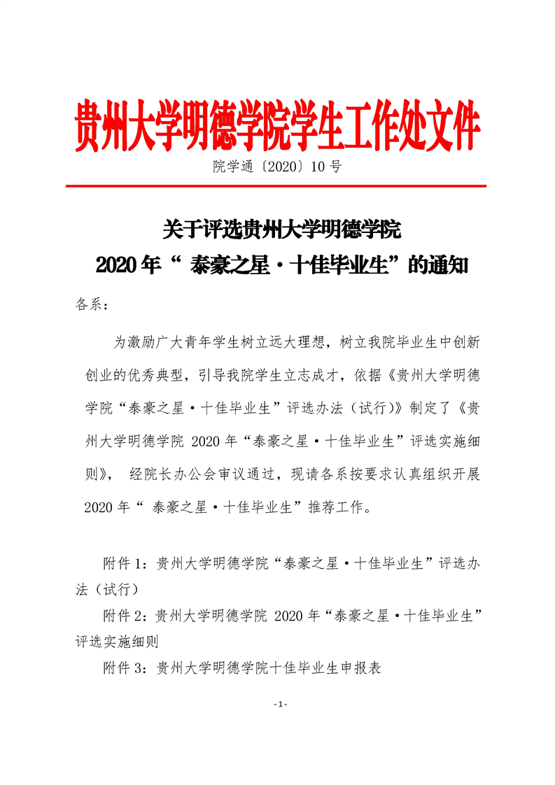 关于评选贵州大学明德学院 2020年“ 泰豪之星·十佳毕业生”的通知