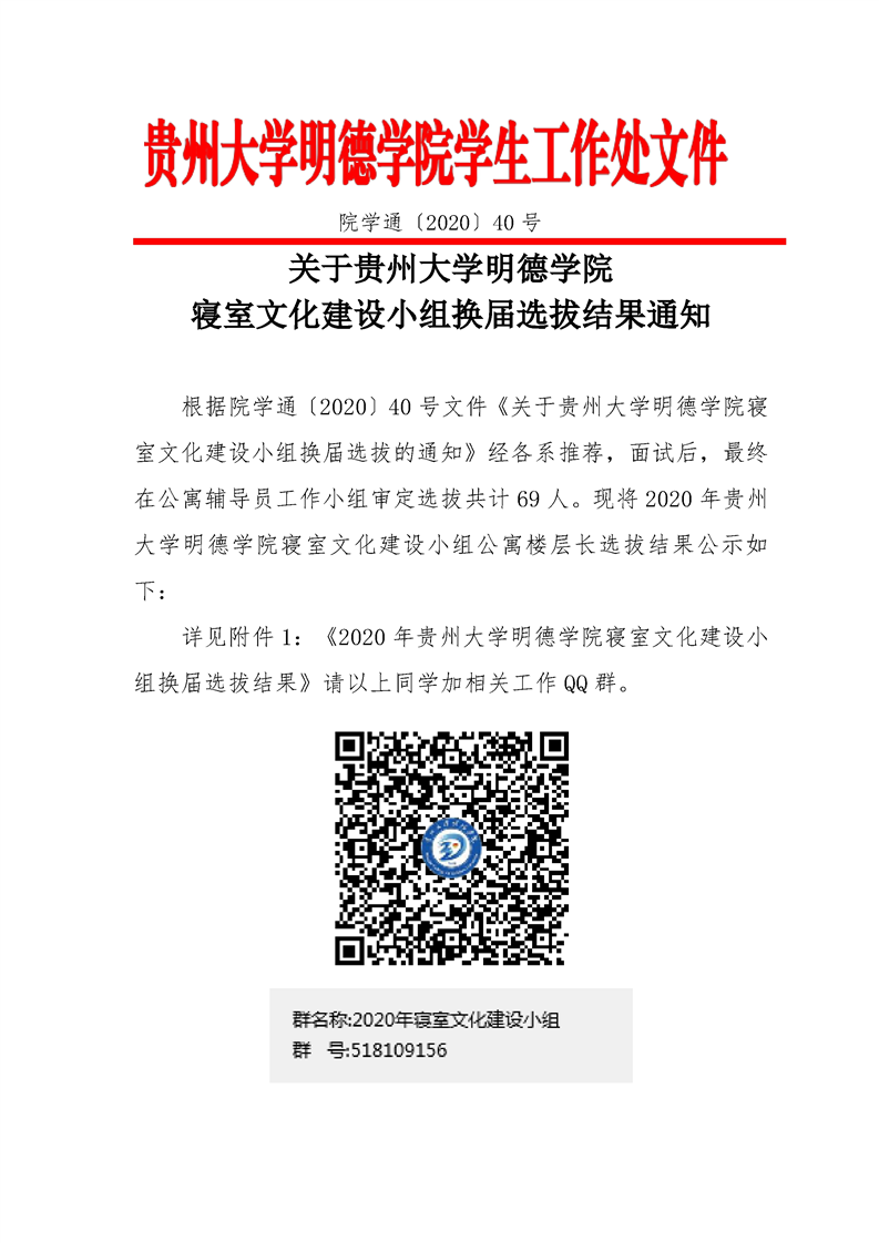 关于贵州大学明德学院寝室文化建设小组换届选拔结果通知