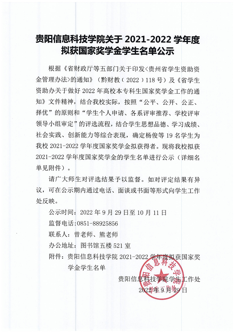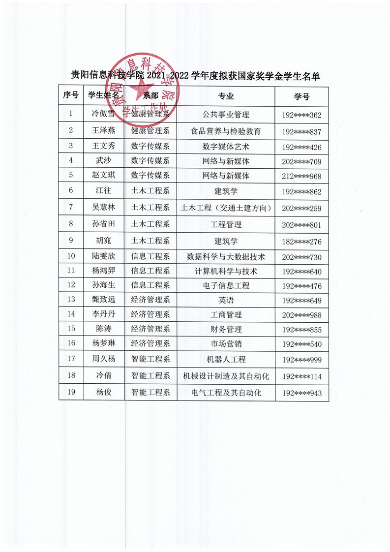 yabo鸭脖官网关于2021-2022学年度拟获国家奖学金学生名单公示