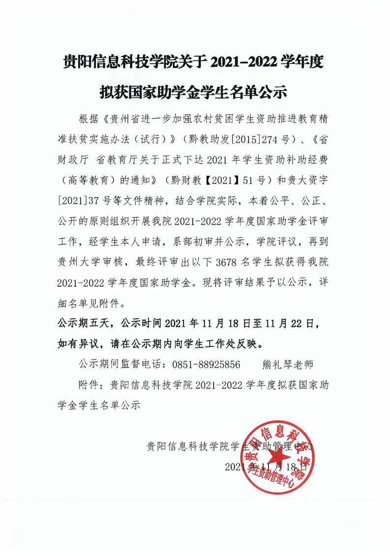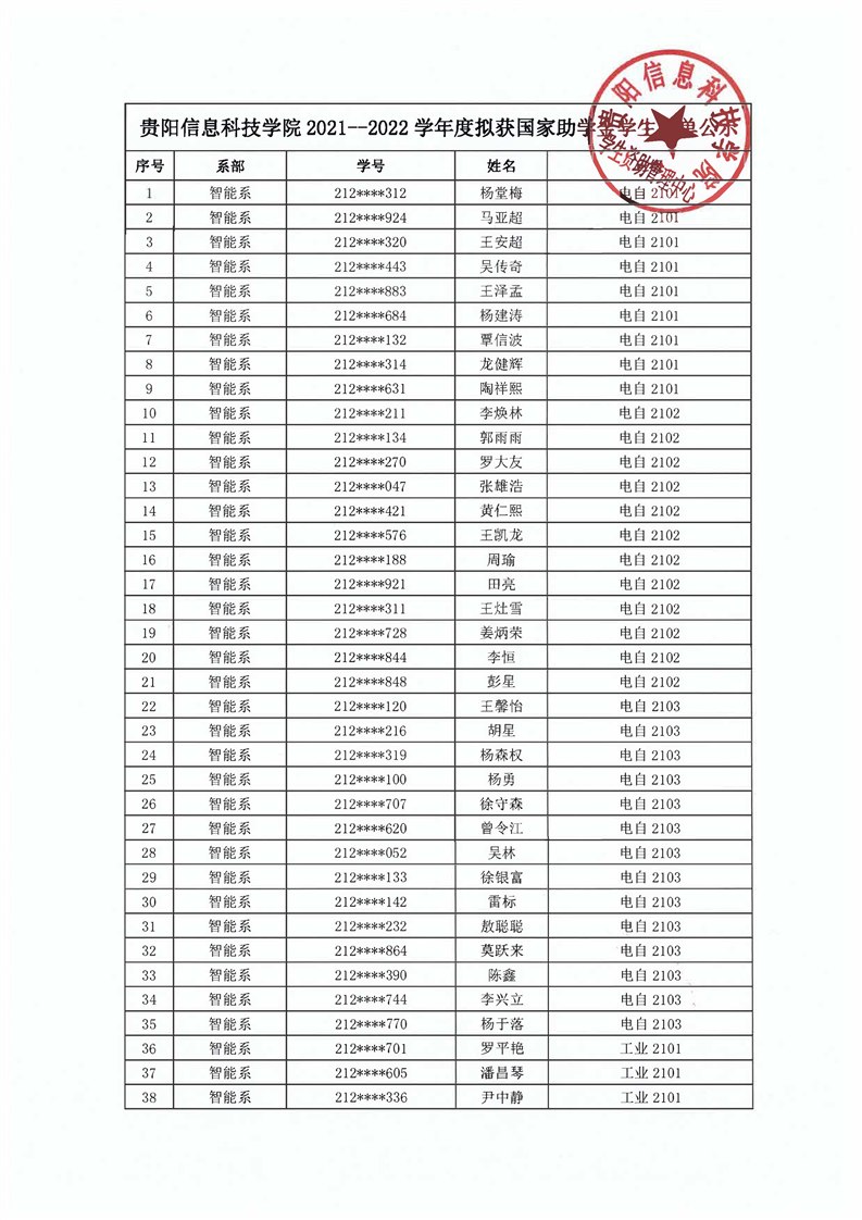 yabo鸭脖官网关于2021-2022学年度拟获国家助学金学生名单公示