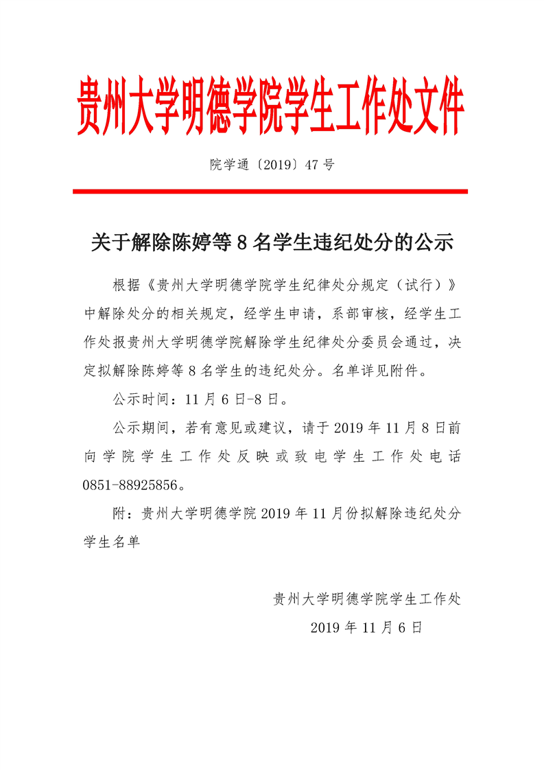 贵州大学明德学院关于解除陈婷等8名学生违纪处分的公示