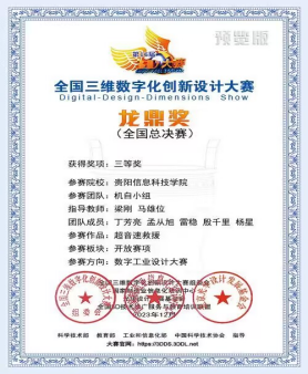 全国三维数字化创新设计大赛(Digital-Design-Dimensions Show,简称:3D大赛,3DDS或3DShow)先后由国家科技部、工信部、教育部、中国科协等部门指导,由国家制造业信息化培训中心等单位主办,已成为全国规模最大、规格最高、水平最强、影响最广的全国大型公益品牌赛事与“数字化+创新创造”行业盛会,已被教育部列入全国高校学科评估体系,是全国普通高校大学生竞赛榜单内竞赛项目之一。在第十六届全国三维数字化创新设计大赛中,自2023上半年启动以来,通过大赛初评、复评及线下决赛,由鸭脖智能工程系梁刚、马雄位老师指导的参赛团队在贵州赛区决赛中获特等奖1项、二等奖1项;全国总决赛中获国赛三等奖1项。