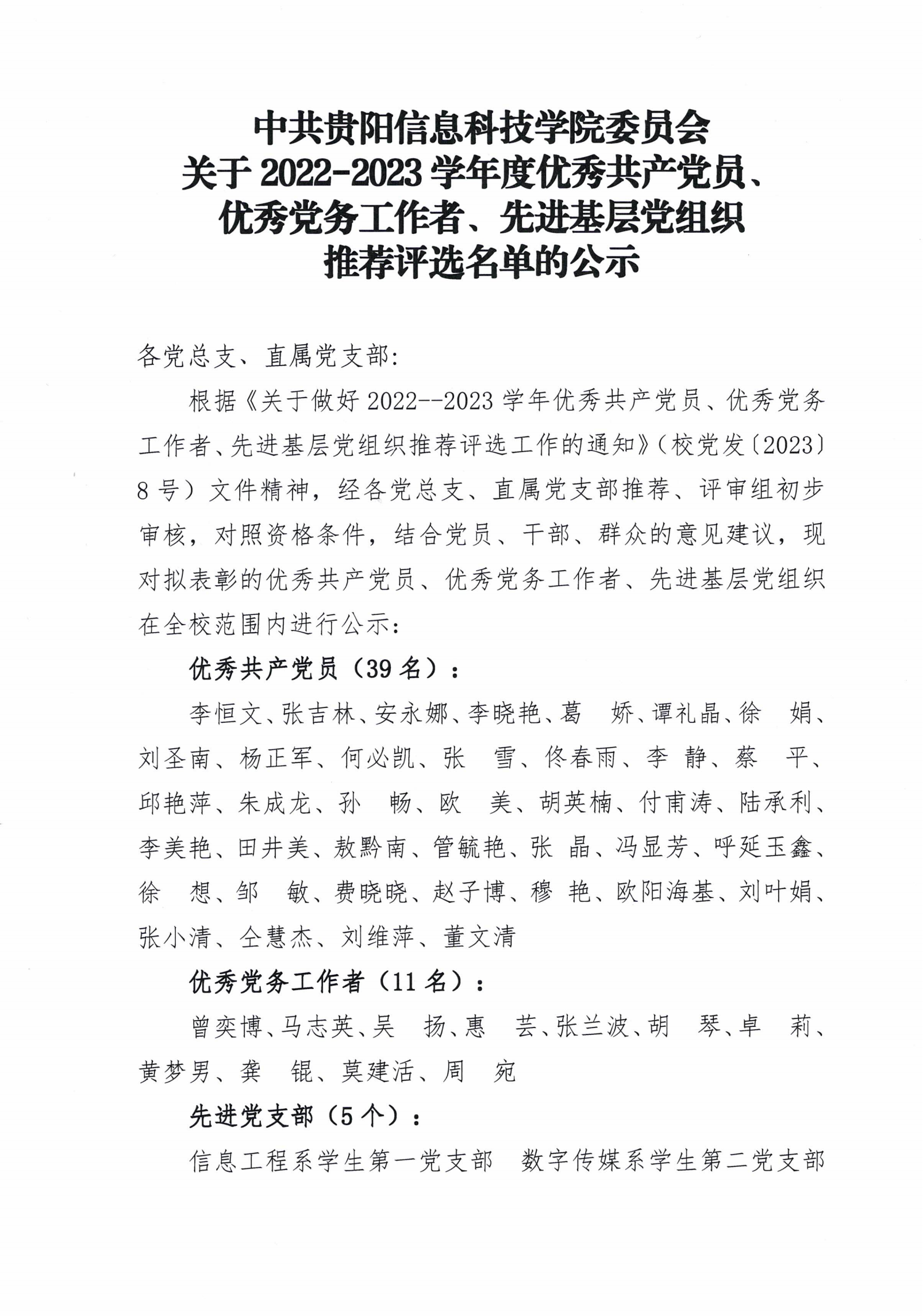中共yabo鸭脖官网委员会关于2022-2023学年度优秀共产党员、优秀党务工作者、先进基层党组织推荐评选名单的公示