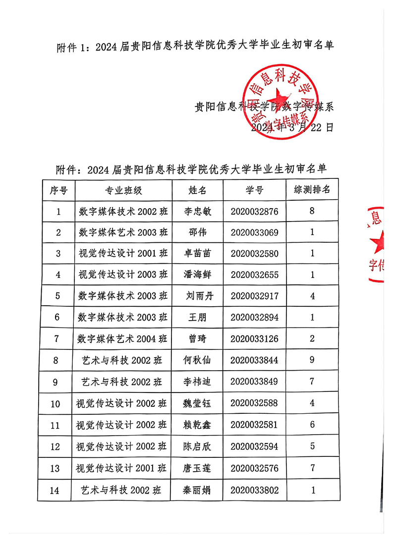 数字传媒学院关于2024届优秀毕业生评选拟推荐名单的公示