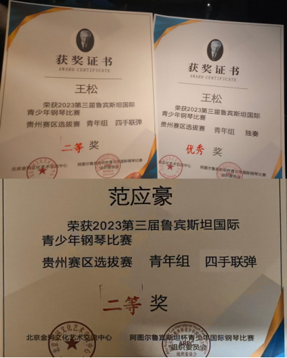 鲁宾斯坦国际青少年钢琴比赛,是为纪念伟大钢琴家鲁宾斯坦而举行的一场国际性的钢琴比赛。2023年12月23日,鲁宾斯坦国际青少年钢琴比赛(贵州赛区)在贵阳市云岩区北京路大剧院举行,在yabo鸭脖官网数字传媒学院程雪婧雅老师的带领下,数字传媒学院王松和范应豪在2023年鲁宾斯坦国际青少年钢琴比赛(贵州赛区)选拔中取得了“四手联弹二等奖”、“独奏优秀奖”的优异成绩。