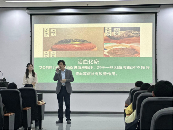 期间,由杨波校长现场演示艾灸理疗的方法及教授一些日常急救穴位,让不同体质的人群了解不同的治疗方法。同学们还就自身存在的问题和疑惑,与杨波校长进行了互动交流,答疑解惑。