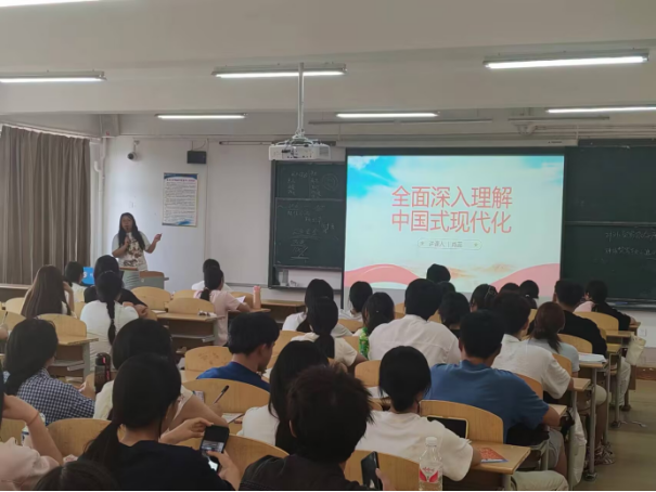 第二课:肖蕊老师讲解《全面深入理解中国式现代化》。通过肖蕊老师的讲解,有助于同学们全面深入理解中国式现代化的中国特色和本质要求。肖蕊老师从认识中国式现代化的发展逻辑和理解中国现代化的核心要义出发,再结合各个专业的学科特点,要求同学们在生活和学习中要深刻把握中国式现代化的前进方向,全面贯彻新发展理念,把实现中华民族伟大复兴作为奋斗目标。