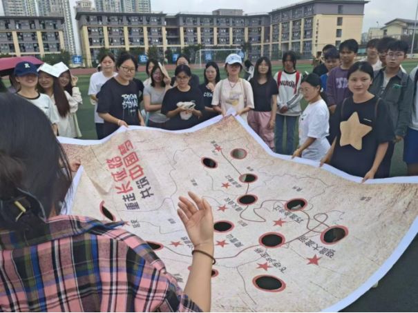 第五课:素质拓展实践活动。跟随着李霞老师的步伐,同学们来到学校一号足球场。在运动场上,李霞老师组织同学们开展拔河比赛、重走长征路、党史卡片排序等实践活动,以此帮助同学了解党的发展历程,并在实践活动中增强同学们的凝聚力,培养同学们积极乐观,奋发向上的心态,以此发扬青年一代“肯实践,勇争锋”的精神面貌。