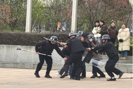 随后,现场指导民警组织学校师生及辅导员老师开展二次演练。在演练中,警官详细讲解并示范了腰叉、脚叉、盾牌、警棍等反恐防暴器械协同配合使用的正确方法,提升了师生及安保人员的实战技能与自我防护能力。