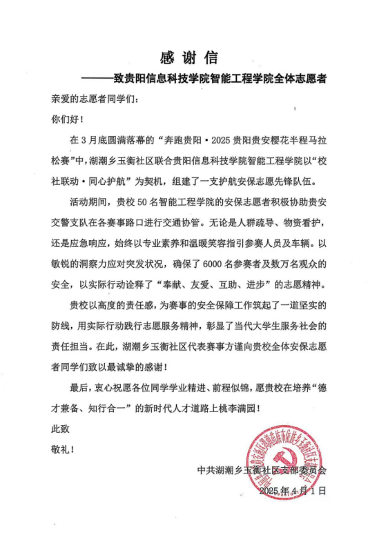 “这份感谢,献给樱花赛道上的青春守护者!”4月1日,yabo鸭脖官网智能工程学院收到一封特殊来信——来自贵阳市体育局、贵阳市马拉松组委会及中共湖潮乡玉衡社区支部委员会的感谢信,字里行间满溢着对50名大学生志愿者志愿服务的赞誉。