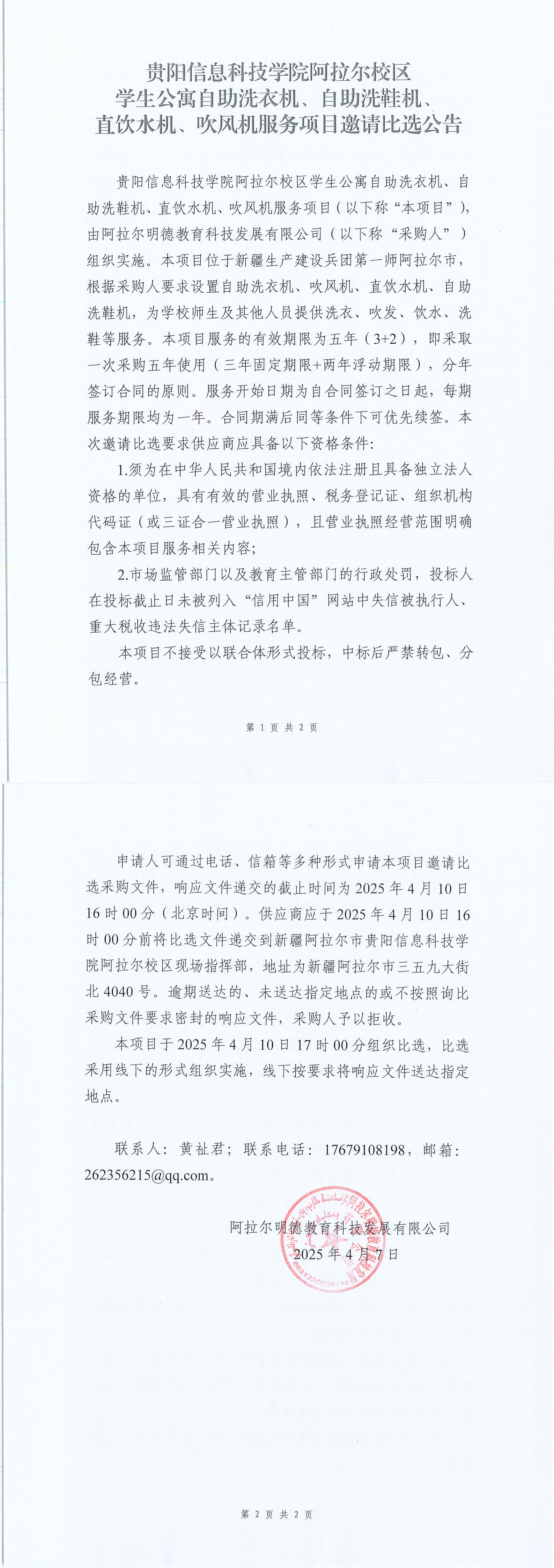 yabo鸭脖官网阿拉尔校区学生公寓自助洗衣机、自助洗鞋机、直饮水机、吹风机服务项目邀请比选公告
