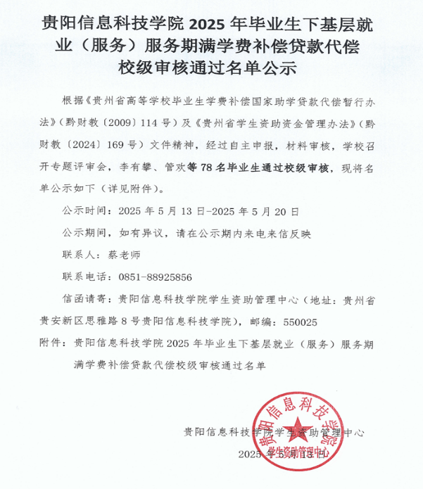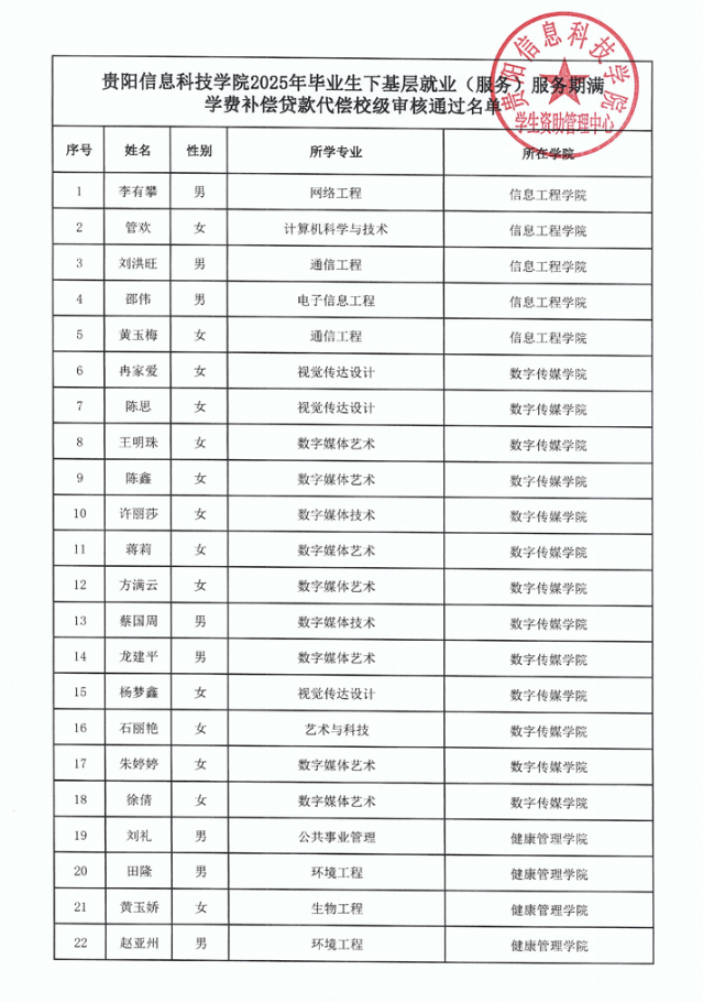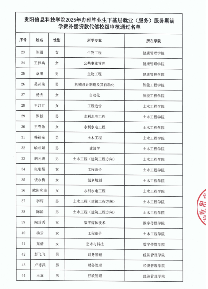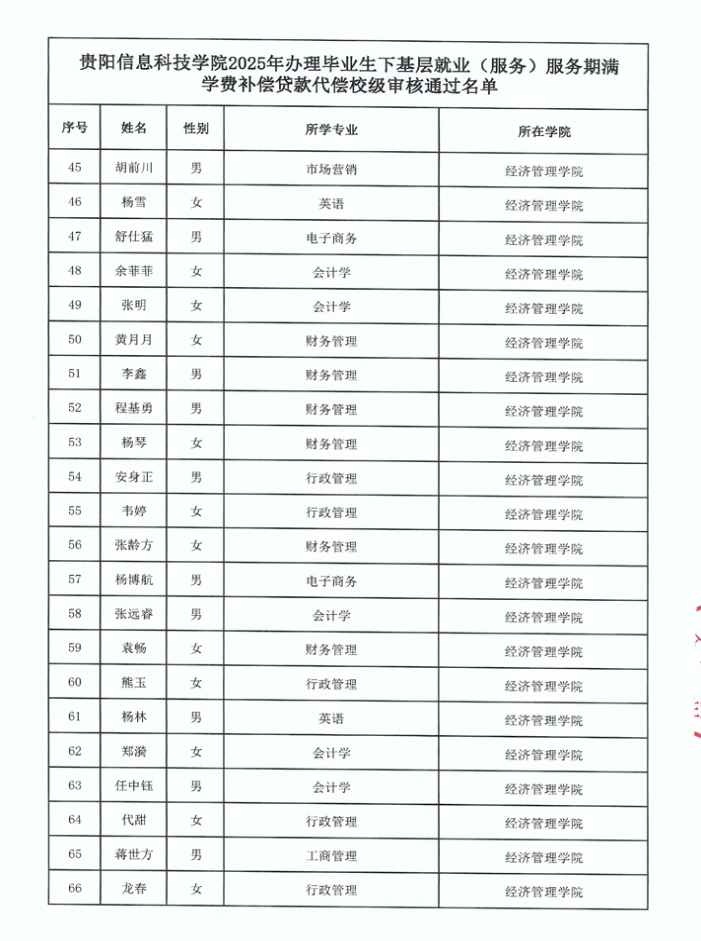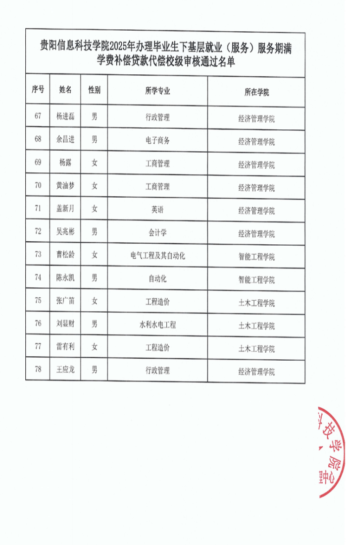 yabo鸭脖官网2025年毕业生下基层就业(服务)服务期满学费补偿贷款代偿 校级审核通过名单公示