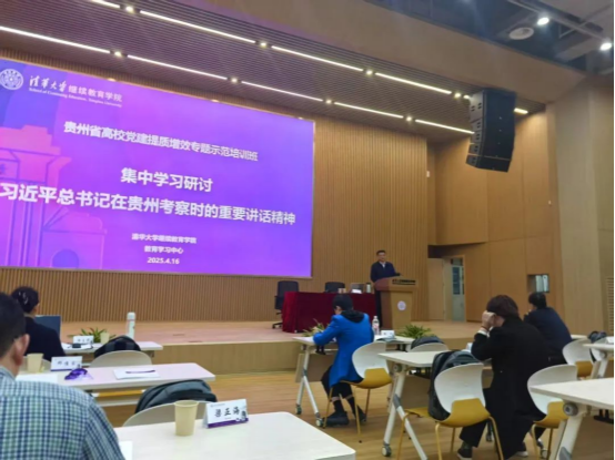 新闻网讯(供稿/供图 党群工作部)近日,由省委组织部、省委教育工委联合主办的贵州省高校党建提质增效专题示范培训班在清华大学举行。省教育厅(省委教育工委)民办高校党组织书记、学校党委书记邓维实在集中学习研讨环节作为民办高校代表,就深入学习贯彻习近平总书记在贵州考察时的重要讲话精神,作了题为《牢记领袖嘱托,坚持以高质量党建引领保障民办教育高质量发展》的交流发言。学习研讨会由省委教育工委副书记李军主持。我省有关省直单位和高校负责同志共50余人参加学习培训。