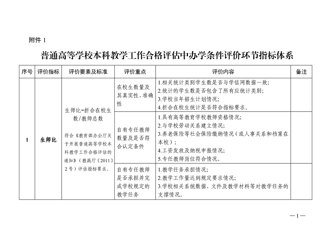 附件1:普通高等学校本科教学工作合格评估中办学条件评价环节指标体系