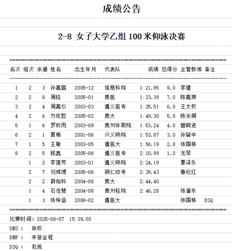 2025年6月8日,贵州省第六届学生运动会游泳比赛在贵州理工学院游泳馆圆满落幕。yabo鸭脖官网代表队凭借出色的表现,在多个项目中斩获佳绩,尤其是孙嘉璐同学在女子仰泳50米和100米项目中双双摘金,成为本届赛事最耀眼的泳坛新星。