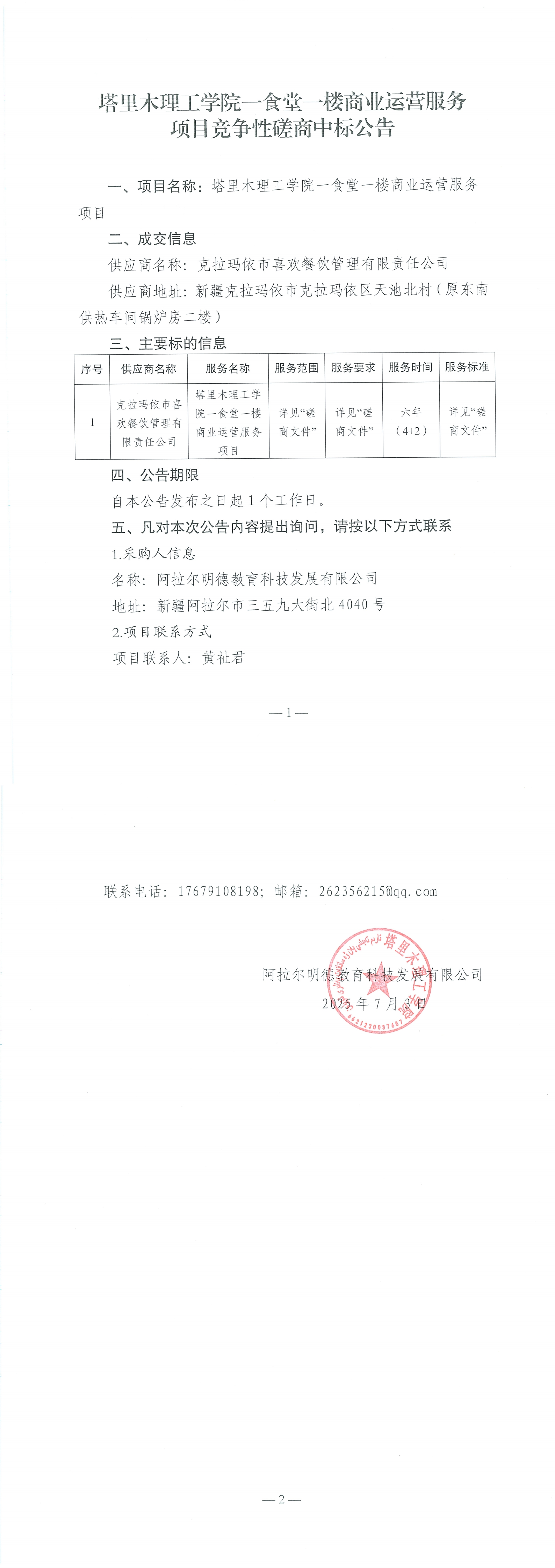 塔里木理工学院一食堂一楼商业运营服务项目竞争性磋商中标公告