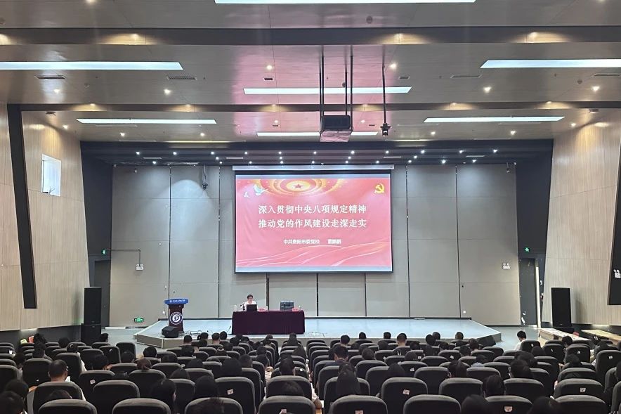 新闻网讯(供稿/供图 党群工作部)为深入学习领会习近平总书记关于加强党的作风建设的重要论述和中央八项规定及其实施细则精神,7月7日,学校特邀贵阳市委党校教授、贵州省首批干部教育培训名师工作室成员董鹏鹏到学校作深入贯彻中央八项规定精神学习教育专题辅导。在家校领导班子成员、各二级学院院长、各职能部室负责人以及全体教职工党员共计200余人参加。鸭脖党委副书记詹凯主持会议。