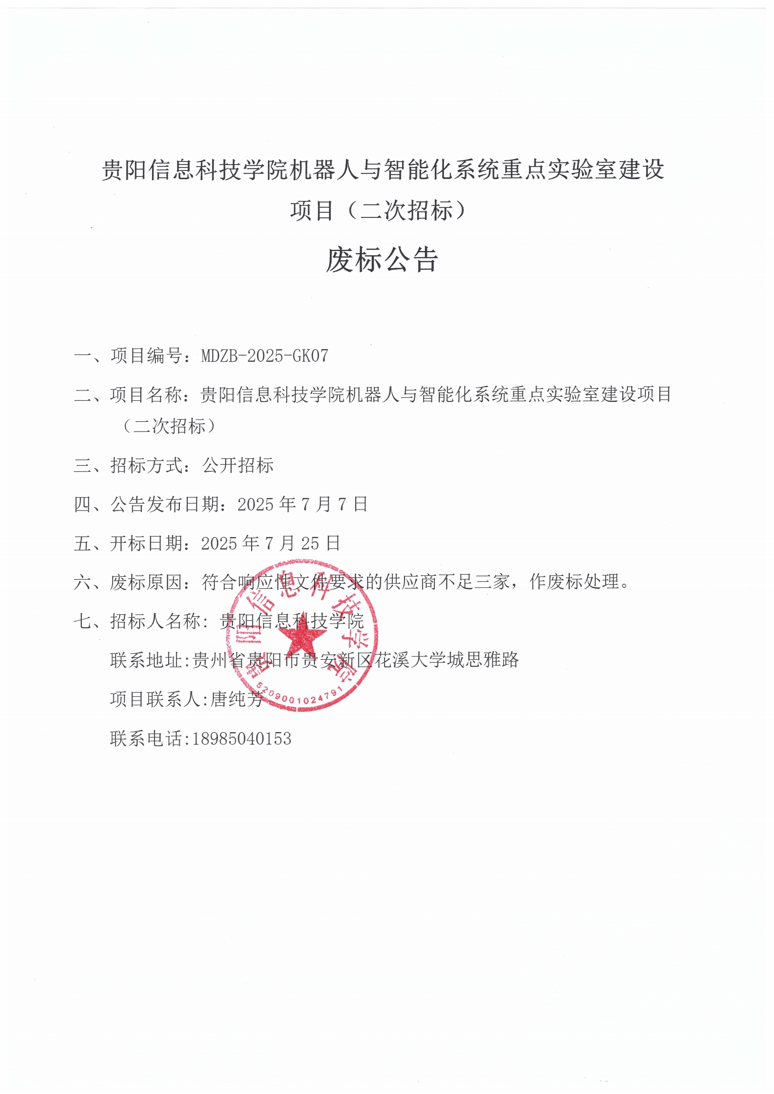 yabo鸭脖官网机器人与智能化系统重点实验室建设项目(二次招标)废标公告