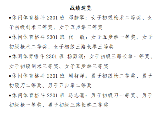 比赛期间,面对全省武林精英的激烈角逐,鸭脖学子始终沉着冷静、从容应战。他们将平日训练的汗水与积累,精准转化为赛场上的实力, 出拳刚劲有力、舞剑行云流水、持枪沉稳利落,每一招式都凝聚着专注与坚持,每一次亮相都展现着专业水准,最终以亮眼战绩交出精彩答卷;同时因严守赛场规则、尊重对手与裁判,以卓越体育素养获评 “体育道德风尚奖”,实现竞技成绩与精神文明的双重丰收!