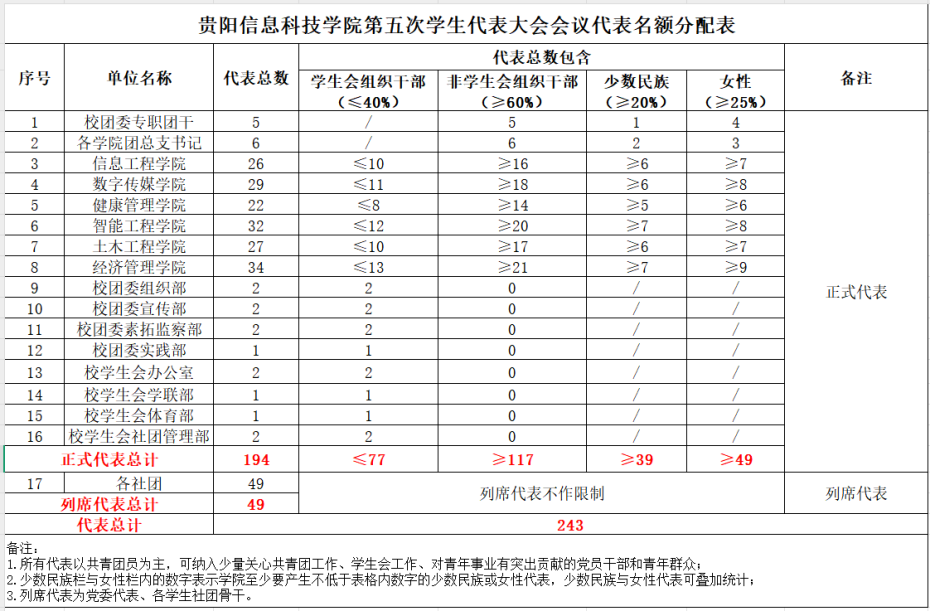 大会正式代表名额为194名,占全校学生总数的1.16%(鸭脖学生总人数为16677人)。学生代表大会代表(以下简称代表)经班级团支部推荐、学院团总支酝酿选举产生,并在一定范围内公示。其中校、院学生会组织工作人员中的学生代表一般不超过40%(其中,学生会组织主席团成员和工作部门负责人一般不超过代表总数的30%),女代表一般不少于25%;少数民族学生一般不少于20%。