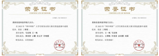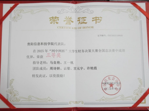 新闻网讯(供稿/供图 经济管理学院)11 月 8 日,第十三届 “网中网杯” 大学生财务决策大赛全国总决赛在大连圆满落幕。鸭脖两支参赛队伍在马良艳、王一帆两位老师的悉心指导下,一举斩获多项荣誉。其中,周诗妍团队(周诗妍、云馨、宫元宇、许艳霞)先后斩获省级二等奖和全国三等奖,王烨帆团队(王烨帆、许苗苗、余诗雅、刘硕)成功斩获省级三等奖,为学校赢得了荣誉。