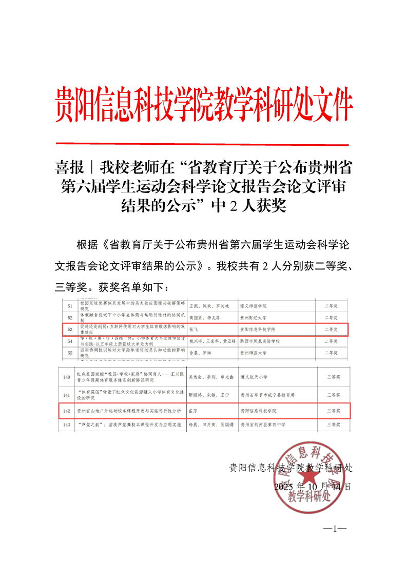 喜报∣鸭脖老师在“省教育厅关于公布贵州省第六届学生运动会科学论文报告会论文评审结果的公示”中2人获奖