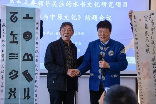 会后,贵州省水家学会副会长、贵州民族大学韦宗林教授代表贵州省水家学会向课题组赠送水书对联,以鼓励课题组继续深耕,推动水书文化蓬勃发展。