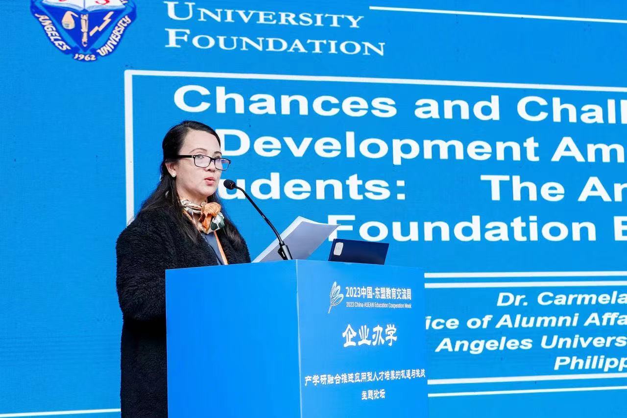 Dr. Nattapat Ruaengmaneeya, Consultant to the Ministry of Higher Education, Research, and Innovation of Thailand, objectively and comprehensively explained the opportunities and challenges that Thailand faces in industry-university collaboration. Dr. Nattapat stated that the innovative development of industry-university collaboration calls for joint efforts from both educational institutions and enterprises, where the collision and integration between educational and industrial thoughts may spark new ideas, driving innovations led by industry. Under the theme of the forum, Prof. Tang Zhimin, the Assistant President of PIM and Director of the China-ASEAN Research Center of PIM explained the advantages of employment-oriented education and the role of dual mentors from both universities and enterprises in talent development. He suggested that universities should look into the future in the China-ASEAN context, establishing a China-ASEAN Enterprise-run University and College Alliance to share international educational resources, discuss latest educational models and beliefs, and set quality standards for China-ASEAN enterprise-run universities and colleges. Dr. Carmela S. Dizon, the Director of Alumni Affairs and Career Services at Angeles University Foundation of Philippines, emphasized the need for comprehensive vocational education integrated throughout university career. She advocated for establishing bridges between students and companies for better understanding their employment needs through diverse channels, and optimizing talent development models to achieve precise alignment between industry demands and educational offerings.