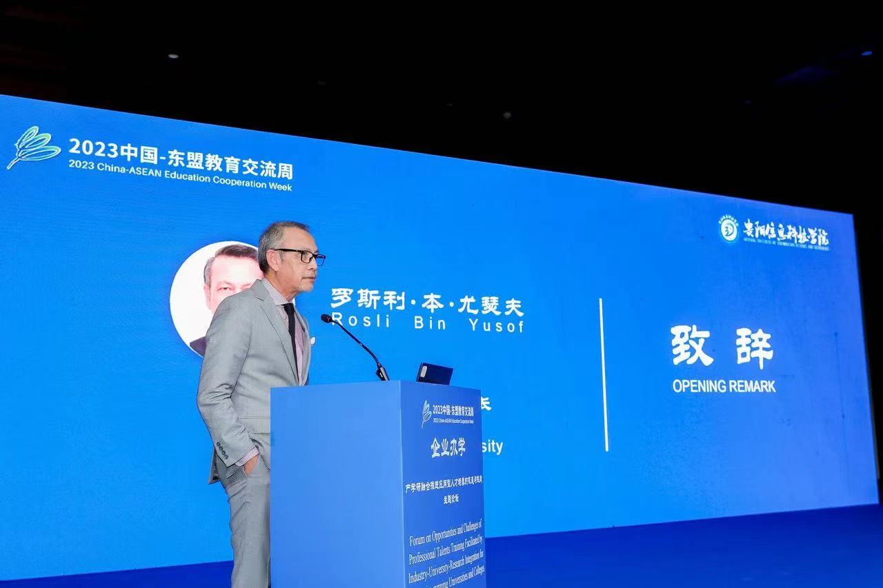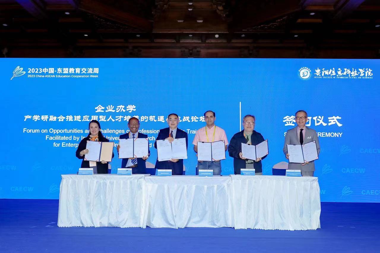 As part of the events during the Opening Ceremony for the 2023 China-ASEAN Education Cooperation Week, Forum on Opportunities and Challenges of Professional Talents Training Facilitated by Industry-University-Research Integration for Enterprise-running Universities and Colleges kicked off on August 28th at Guiyang Institute of Information Science and Technology, attracting experts and scholars from universities and colleges, representatives from research institutions and government, home and abroad. Countries ranged from Thailand, Malaysia, Myanmar, Philippines to Timor Lorsa’e. The forum is aimed to discuss and explore innovative ways to train and cultivate application-oriented talents so as to enhance international exchange and cooperation with ASEAN countries.
