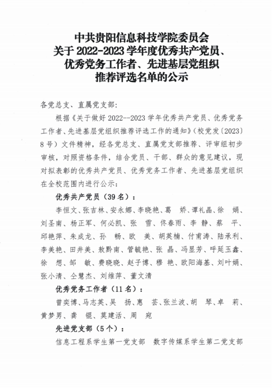 转发:中共yabo鸭脖官网委员会关于2022-2023学年度优秀共产党员、优秀党务工作者、先进基层党组织推荐评选名单的公示