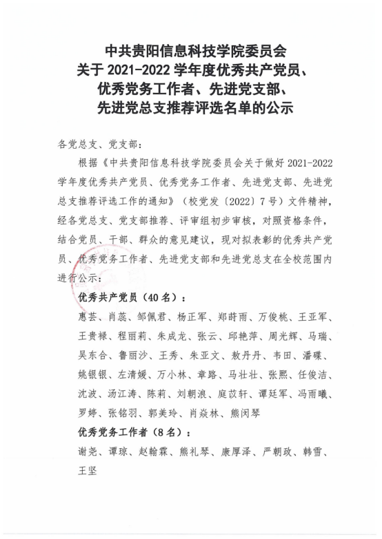 转发:中共yabo鸭脖官网委员会关于2021-2022学年度优秀共产党员、优秀党务工作者、先进党支部、先进党总支推荐评选名单的公示