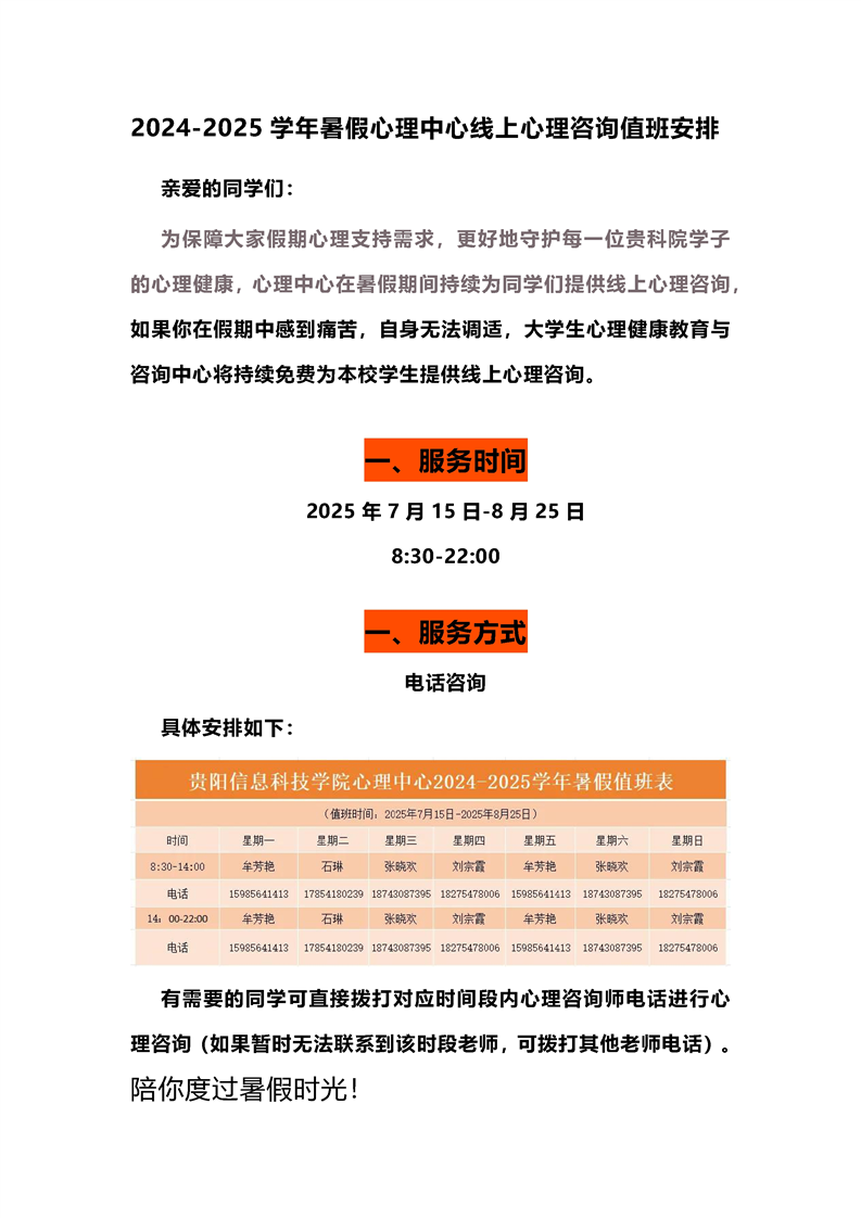 2024-2025学年暑假心理中心线上心理咨询值班安排