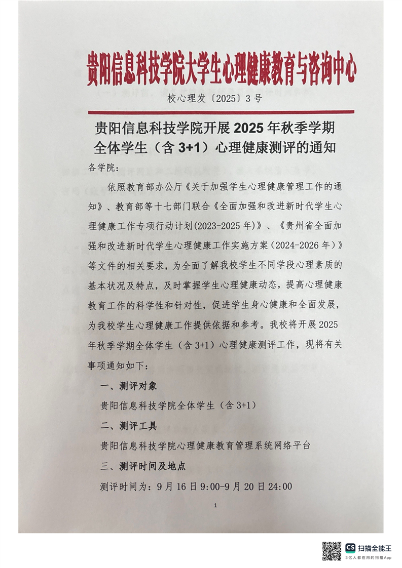 yabo鸭脖官网开展2025秋季学期全体学生(含3+1)心理健康测评的通知