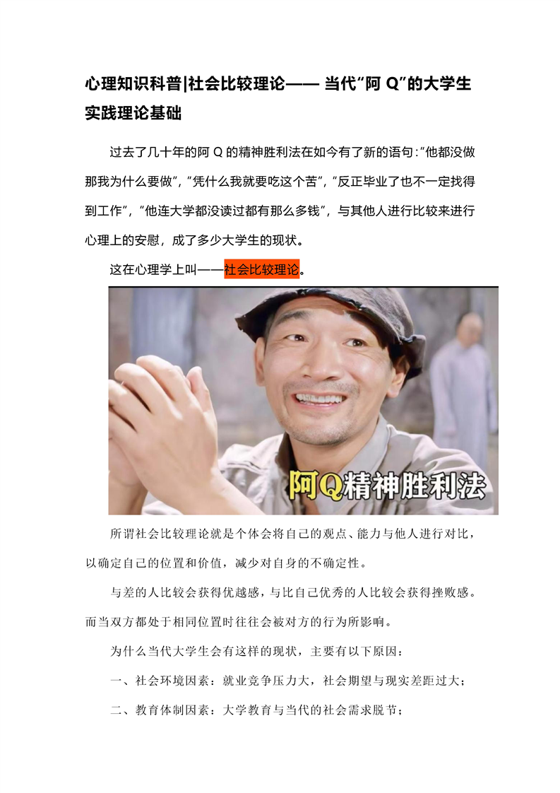 心理知识科普|社会比较理论—— 当代“阿Q”的大学生实践理论基础