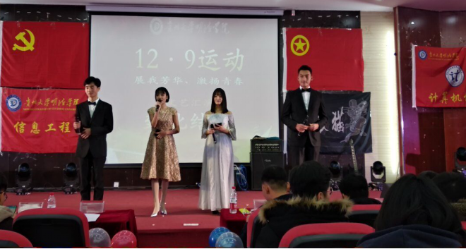 首先由王朋虎老师为本次活动的致开幕词,强调了当代大学生应该学好专业知识、专业技能,理性爱国。接着就播放纪念“一二·九”运动83周年的纪录片和信息系师生对“一二·九”的纪念视频,视频表述了在1935年12月9日,北平大学生数千人举行了抗日救国游行示威,反对华北自治,反抗日本帝国主义,要求保全中国领土的完整,掀起全国抗日救国新高潮。这是中国共产党领导的一次大规模学生爱国运动。北平学生的爱国行动,得到了全国学生的回应和全国人民的支持,形成了全国人民抗日民主运动的新高潮,推动了抗日民族统一战线的建立。视频播放结束全体师生起立奏唱国歌,每个人脸上都显得庄重严肃。之后文艺汇演便正式拉开了帷幕。