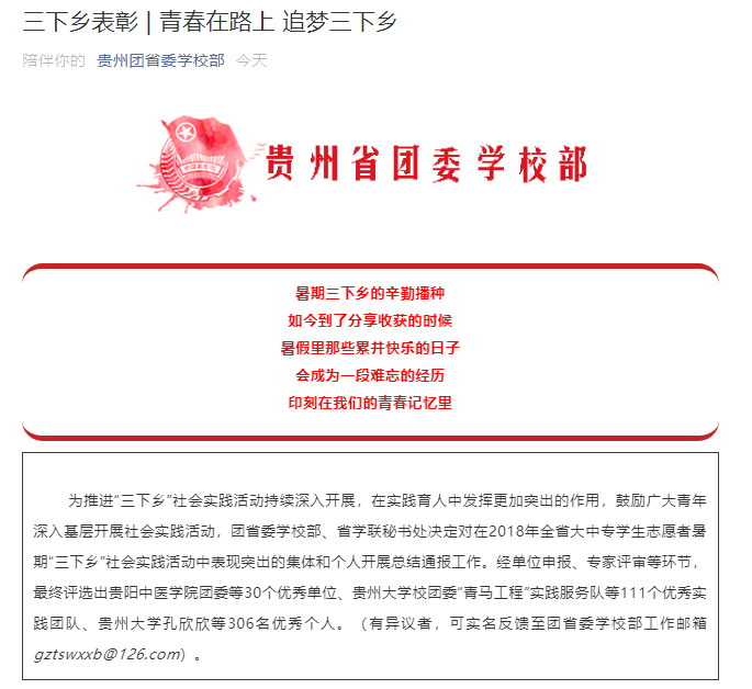 [喜报] 我系荣获2018年贵州省暑期“三下乡”社会实践活动“优秀团队”