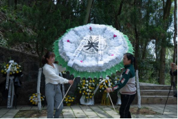 默哀完毕,随着激昂深情的《献花曲》响起,党员代表向英烈敬献花圈、整理挽联。