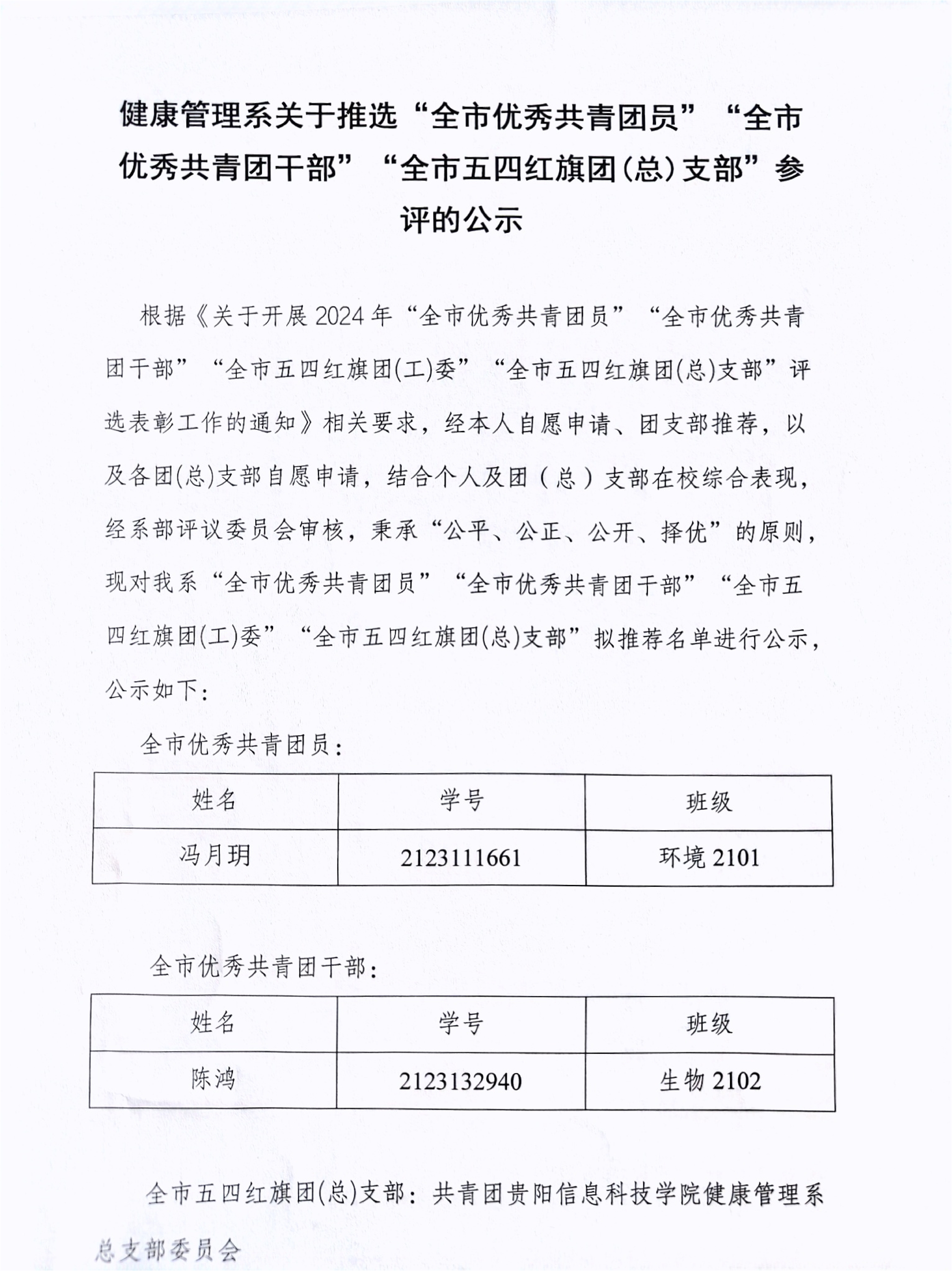健康管理学院关于推选“全市优秀共青团员”“全市优秀共青团干部”“全市五四红旗团(总)支部”参评的公示