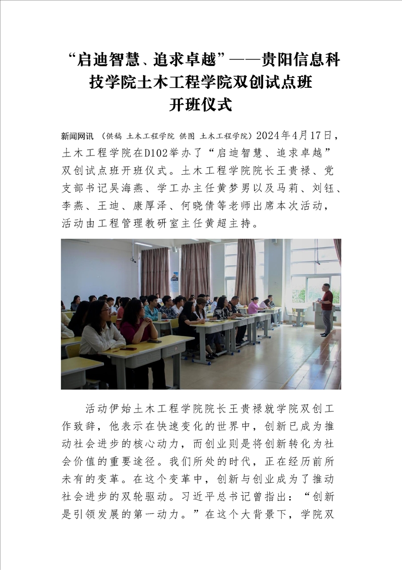 “启迪智慧、追求卓越”——yabo鸭脖官网土木工程学院双创试点班开班仪式