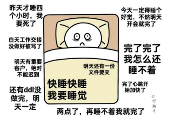 “今天我说的那句话实在是不合适……她那么说是不是不喜欢我?明天我的演讲不会出什么岔子吧……”“只能睡三个小时了,我要快点入睡,再不睡觉明天一定没精神了!”当小高准备入睡的时候,令他担忧的事情、睡不着觉的恶果,总是一件一件蹦到脑海之中,让他不能安稳地睡一个觉。小高对此总是很苦恼,他不喜欢这种只发生在睡前的“一日三省吾身”。随着这些想法被唤起的焦虑和恐慌,会十分打扰小高的睡眠。