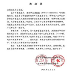 近日,我院收到一封来自岩洞镇新洞村村民委员会发来的表扬信,信中对土木2405班周国胜同学在寒假期间积极参与大学生“返家乡”志愿服务活动的突出表现予以表扬和感谢。